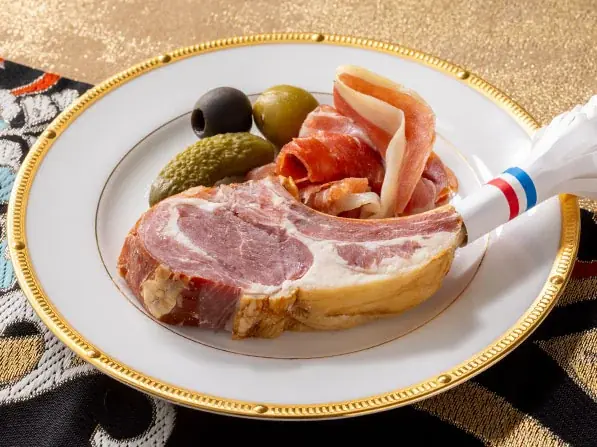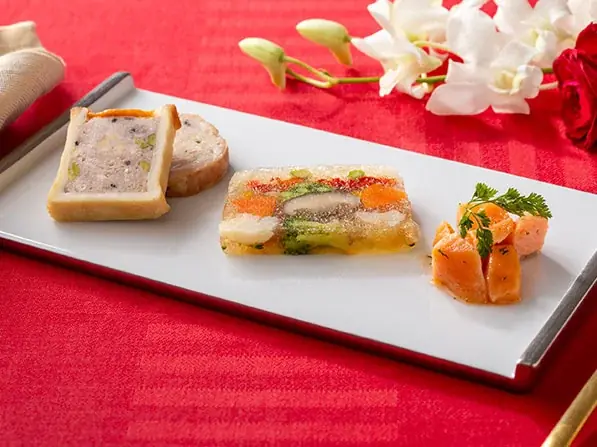 仔羊のスモークは骨付きロースをスモークで仕上げ、風味豊かに提供されます。トリュフ入りチキンローストは鶏もも肉に刻んだトリュフを入れて焼き上げたもので、香りの良さが特徴です。彩り野菜のゼリー寄せはコンソメゼリーによるテリーヌ仕立てで、見た目の華やかさと素材の旨味が活かされています。