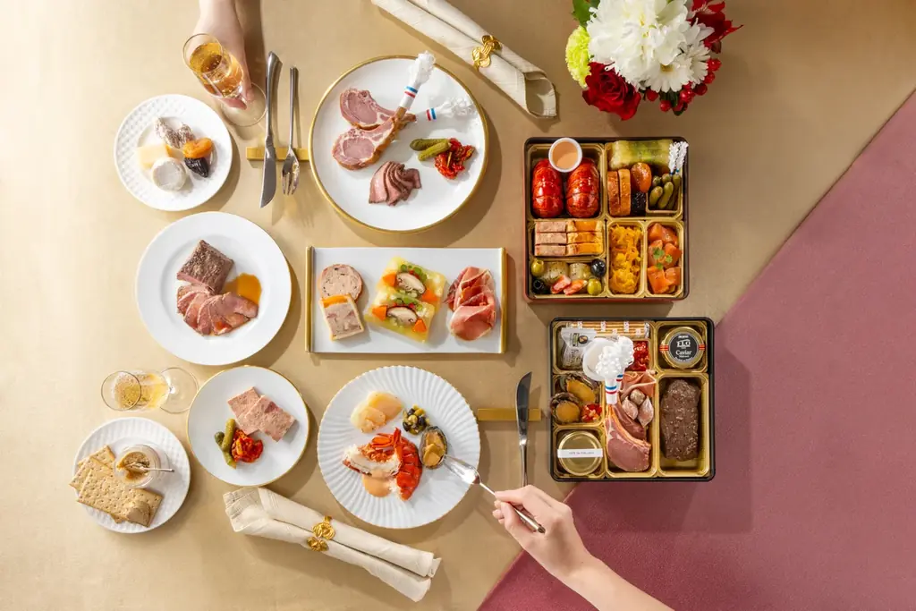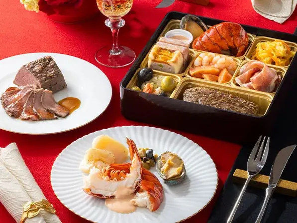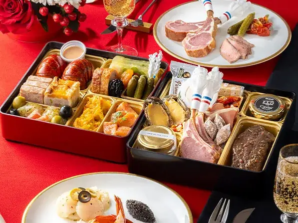 主な食材(抜粋) フランス産キャビア(※二段重のみ)、フォアグラのパテ(※二段重のみ)、オマール海老、アメリカ産牛モモ肉のロースト、仔羊のスモーク、トリュフ入りチキンロースト、合鴨のパテのパイ包み、サーモンのディル風味等
