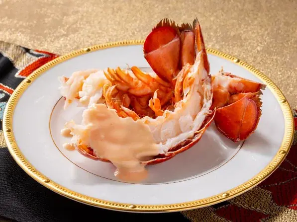 共通で入る代表的なメニューには、オマール海老のカクテルソース、アメリカ産牛モモ肉のロースト、合鴨のパテのパイ包み、サーモンのディル風味(レア仕立て)などがあります。オマール海老は殻つきで提供され、カクテルソースとの相性が強調されています。牛モモ肉のローストはスライスしてグレイビーソースをかけていただくことが推奨されています。