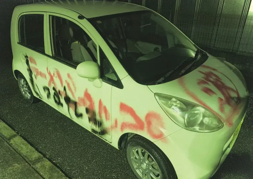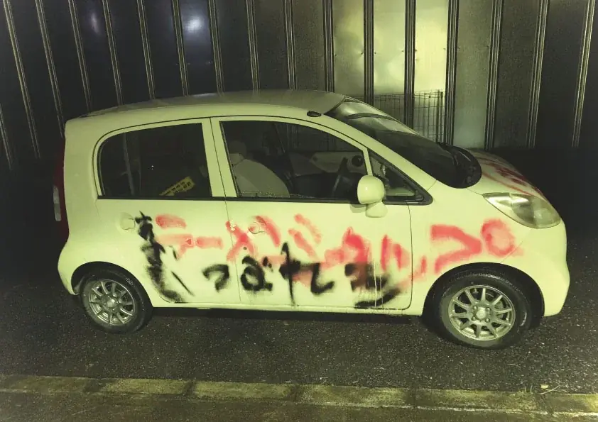 問題が表面化したきっかけとして、店主の車が店舗駐車場で何者かによりスプレーで落書きされる被害に遭ったことが報告されている。プレスリリースには落書きされた店主の車の写真が複数点あると明記されており、被害の事実は外部に提示されている。