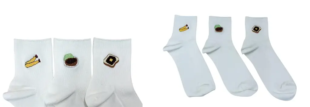 今回のポップアップで先行販売される靴下は、名古屋を代表する食文化をモチーフにした合計6種類です。プリントタイプと刺繍タイプに分かれ、それぞれ表現の仕方が異なります。
