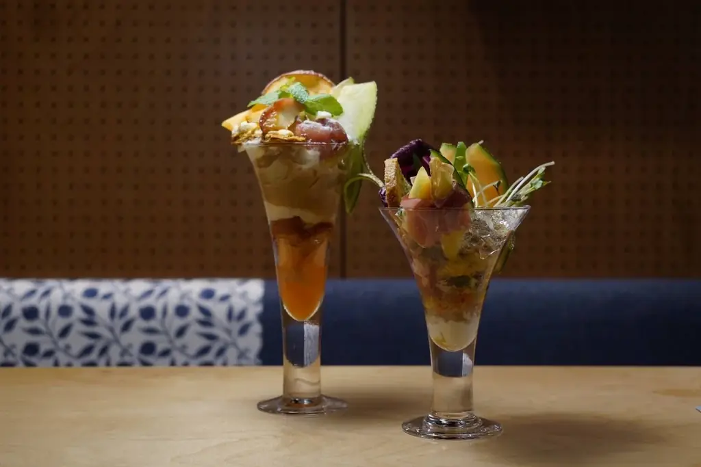 それぞれのパフェは素材選びと調理法で異なる顔を見せます。スイーツ系は果実の甘さと濃厚なクリーム、ブルーチーズやナッツでアクセントを付け、食事系は生ハムの塩気とパスタの食感、バルサミコやアンチョビでしっかりとした味付けを施しています。