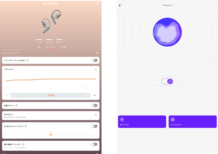 | 主要な技術 | 16.2mm DLCドライバー、LDAC対応(Hi-Res Audio Wireless認証)、OpenSoundテクノロジー、JBL空間サウンド、Personi‑Fi 3.0、Auracast™対応 |