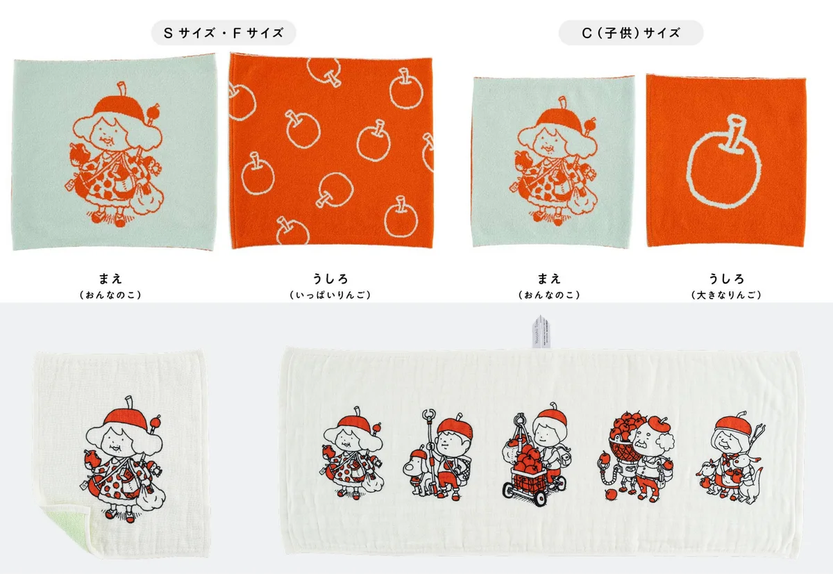 商品はイラストのキャラクターとりんごをモチーフにしており、ハラマキやレッグウォーマー、タオルなど、ほぼ日で定番のアイテムが揃います。会場限定のアクリルキーホルダーやステッカーは現地でのみ購入できるアイテムとして用意されています。