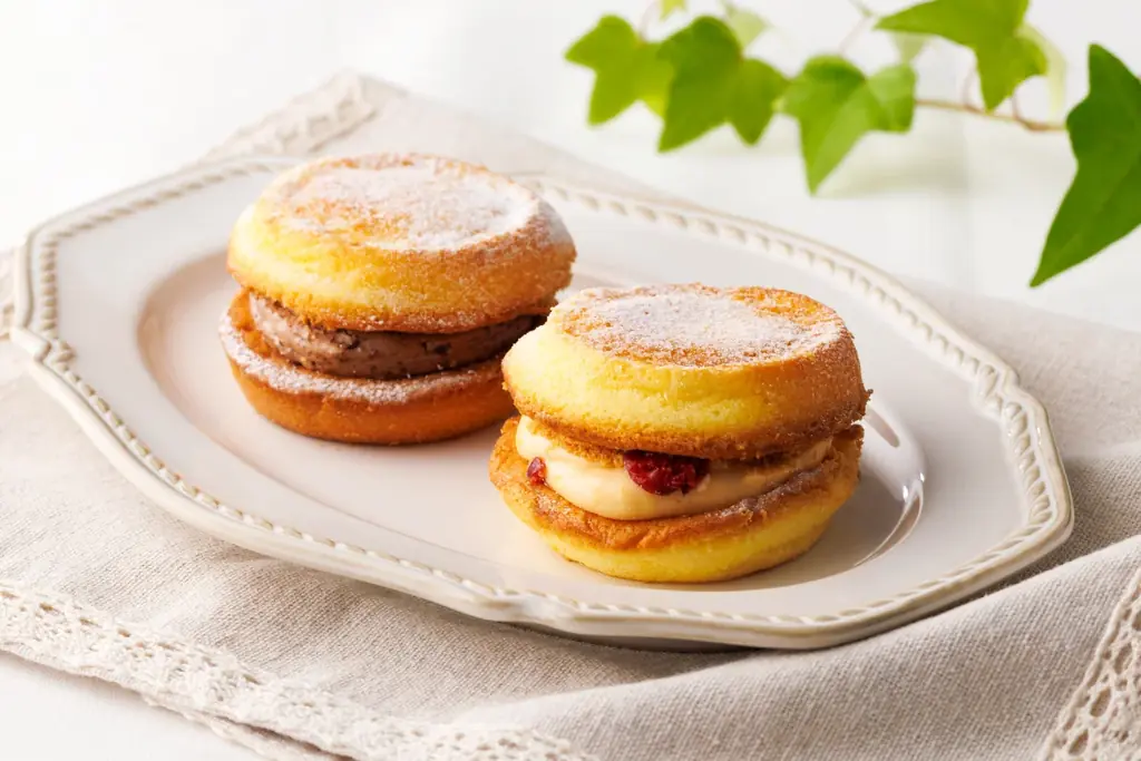 タンテ・アニーバーガーは、クリームチーズを練り込んだしっとりとした生地に2種類のクリームをサンドした、2個セットの商品です。セット内訳はチェダー&クランベリー 1個とチョコレート 1個で、食べ比べを想定した組み合わせになっています。