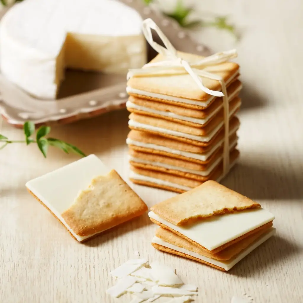 - カマンベールパウダーを練り込んだホワイトチョコでサンドしたクッキー。カマンベールチーズ75%使用のチーズパウダーとチョコレートコーチングを採用。