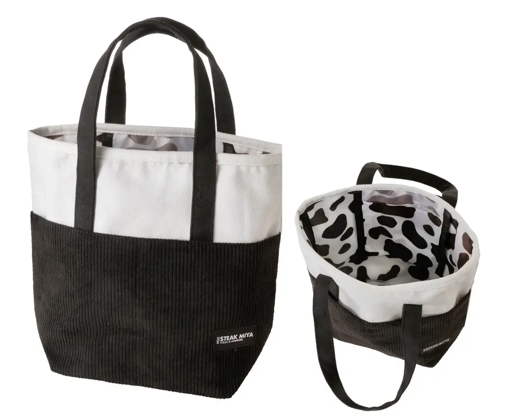 小ぶりなランチバッグとして使えるサイズ。ステーキ宮の公式キャラクター「も~たろ~」をイメージした牛柄の裏地がワンポイントになっており、白黒のシンプルなデザインは利用シーンを選びません。