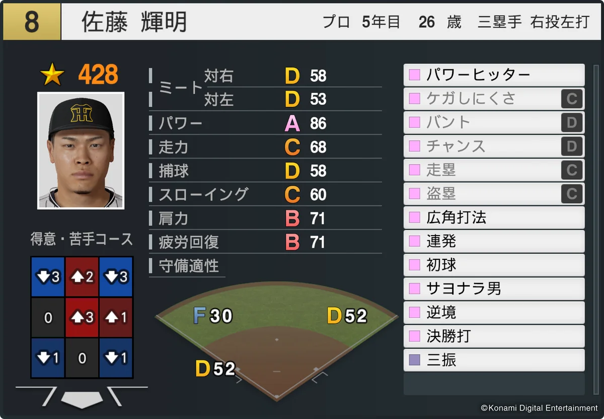 - サード守備適性:E49 → D52(『プロスピ2025』)