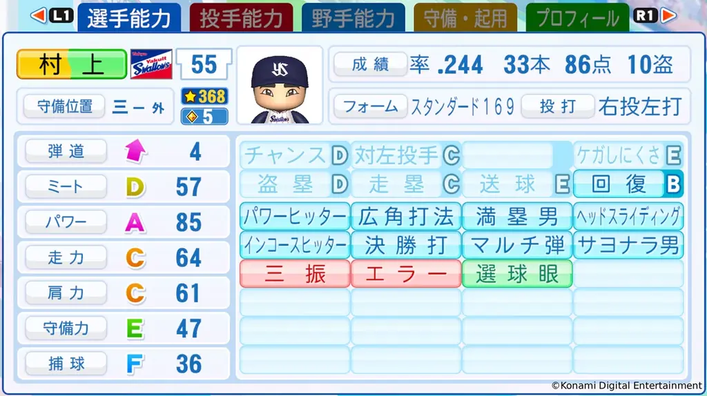 『パワプロ2025』では、東京ヤクルトスワローズの村上宗隆選手のパワーがA81 → A85に引き上げられました。これにより長打力を重視するゲーム内での影響が大きくなります。