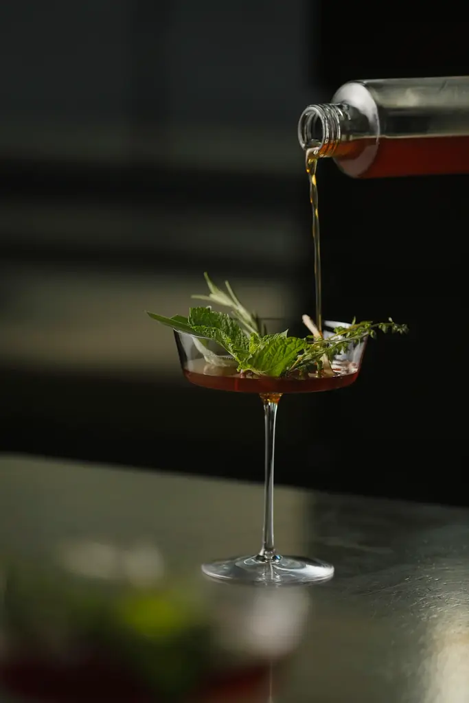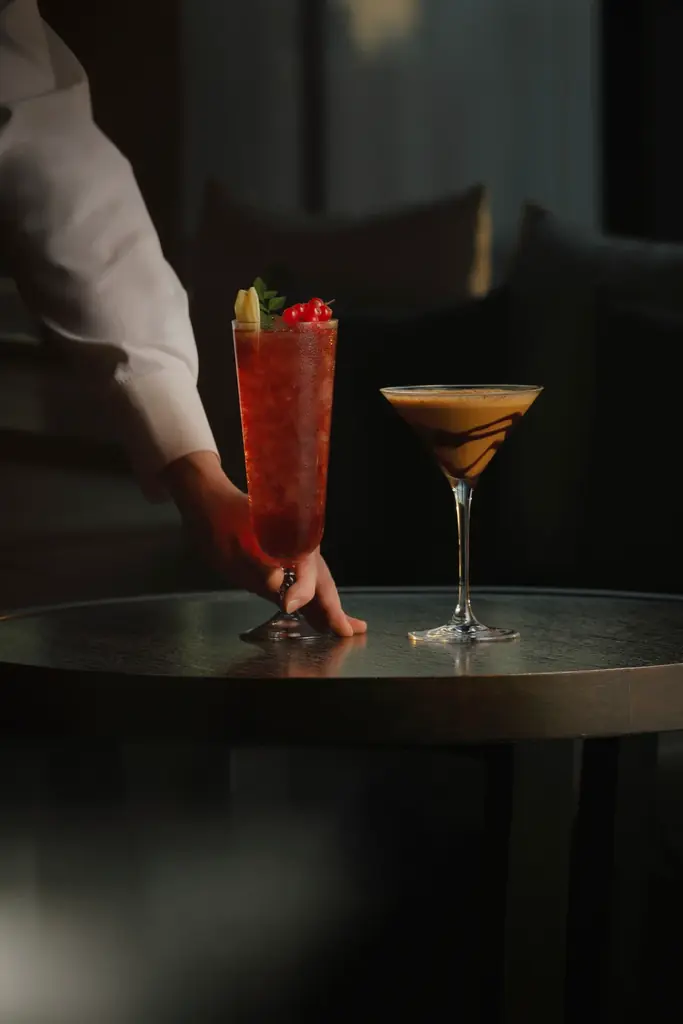 パルフェは洋梨や白ワインジュレ、ライチのエスプーマなどを重ねたテクスチャーの変化を楽しめる内容で、カクテルは国産ウイスキーを用いたマンハッタン系や赤ワインベースの温かみのある一杯、ティラミスを模したマティーニなどを提供します。