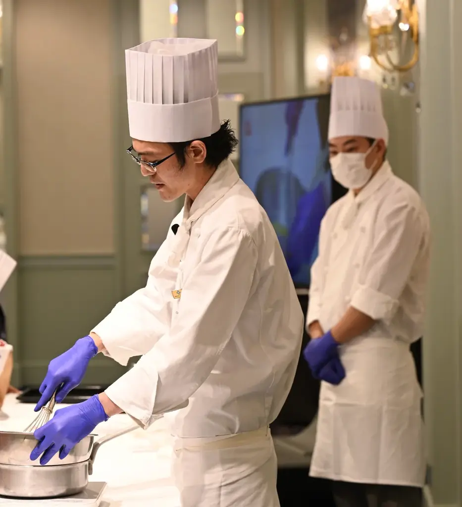 今回のテーマは『サンセバスチャンケーキ』。チョコレート生地とプレーン生地を重ね合わせて断面に美しい石畳模様を描くデザインが特徴のケーキです。ホテルならではの工程や技法を、プロの手さばきで解説するデモンストレーションに加え、参加者が実際にスポンジ生地を組み合わせ、盛り付けを体験し、完成したケーキを持ち帰ることができます。
