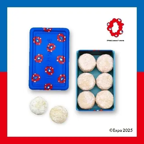 - 価格: 1缶 税込1,620円。公式キャラクター「ミャクミャク」を総柄であしらったオリジナル缶に、定番人気のクッキー・ポルボロンを詰めた商品。各日数量限定。おひとり様3点までの購入制限あり。