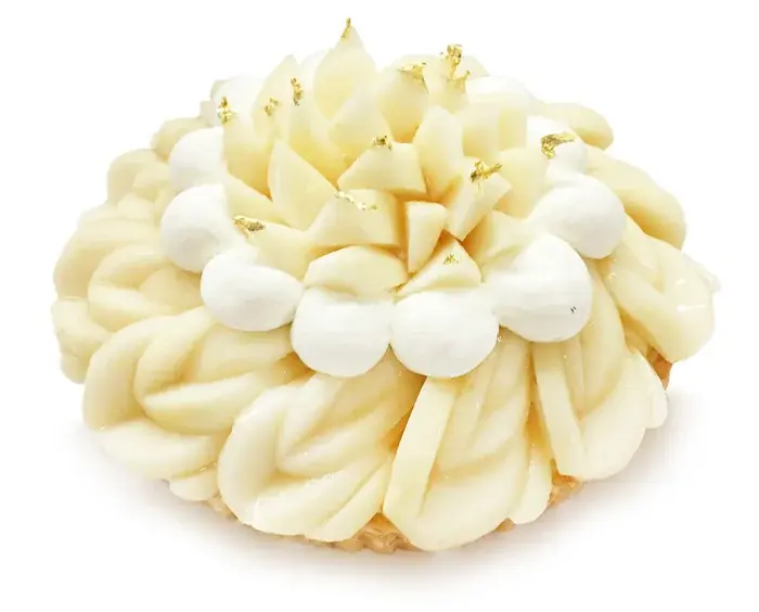 今シーズンのケーキは、渡辺果樹園のル レクチエの芳醇な香りととろけるようななめらかさを最大限に生かす設計となっている。果実の風味に合わせて、甘酒を使用したクリームを組み合わせることで、素材の奥行きを出している。
