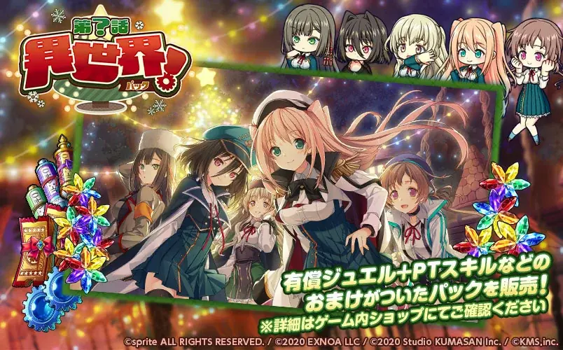 | 記念パック | 『第?話 異世界!』パック(有償ミストジュエル、限定PTスキル、SS確定10連ガチャ切符 等) |