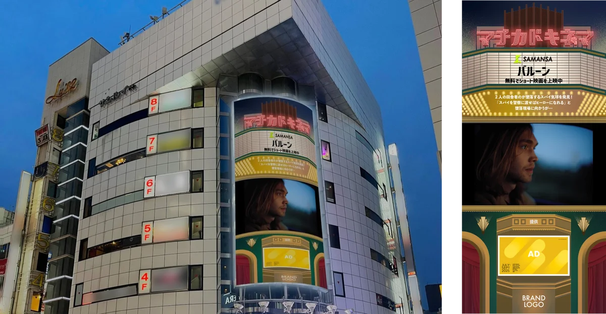 「マチカドキネマ」は、SAMANSAが厳選したショート映画の上映を中心に据え、その前後または同時に広告(動画および静止画)を配信する形式を採ります。従来のDOOH広告とは異なり、映画というコンテンツ体験を通じて高い注視率と長時間の広告接触を実現することを目的としています。