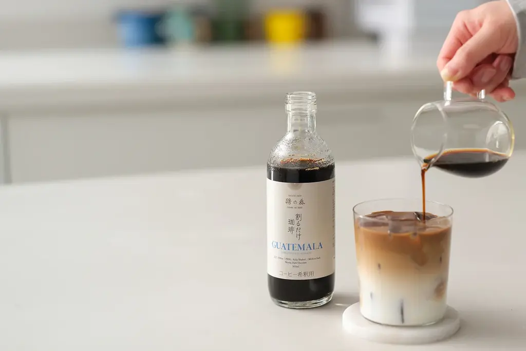 「割るだけ珈琲」はその名の通り、希釈して飲むエスプレッソベースです。牛乳で割ればカフェラテやホットカフェラテとして、また水やお湯で割ればアイスコーヒーやホットコーヒーとして楽しめるよう設計されています。様々な割りものでの飲用を想定し、好みの希釈率で風味を調整できる点を特徴としています。
