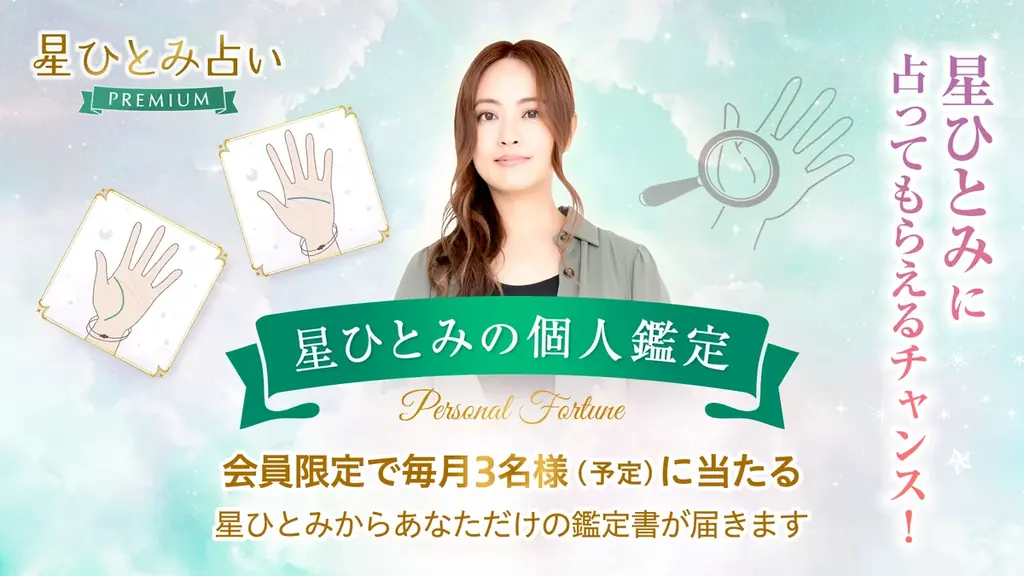 「星ひとみ占いPREMIUM」は、テレビや書籍などで活躍する占い師・星ひとみさんが監修する有料会員向けサービスです。オリジナル占術「天星術」を中心に、「手相」「スターカード」「姓名判断」を組み合わせて鑑定を行います。