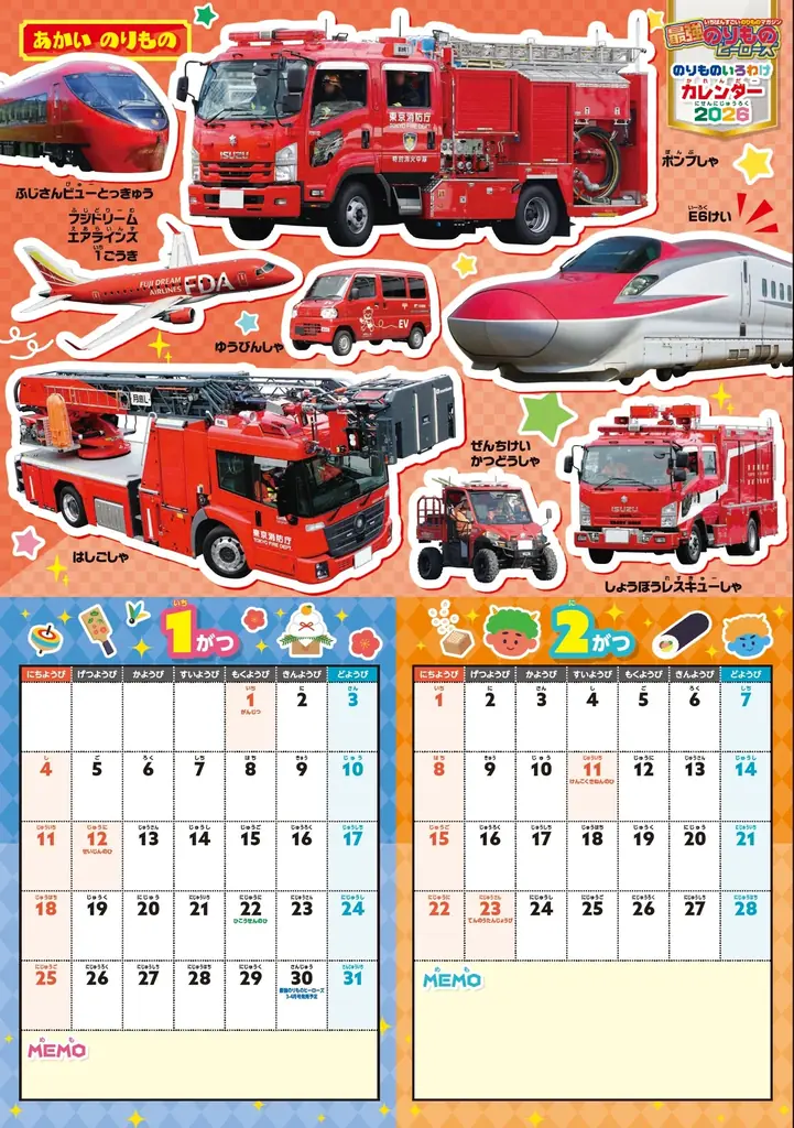 DVD以外の付録としては、のりものシールと、のりものいろわけカレンダー2026も同梱されています。シールは各種のりものや人気キャラクターが多数含まれ、カレンダーは「はたらくクルマ」「新幹線」「特急」「飛行機」「船」などを色ごとに分類して掲載しているため、視覚的にも楽しめる構成です。