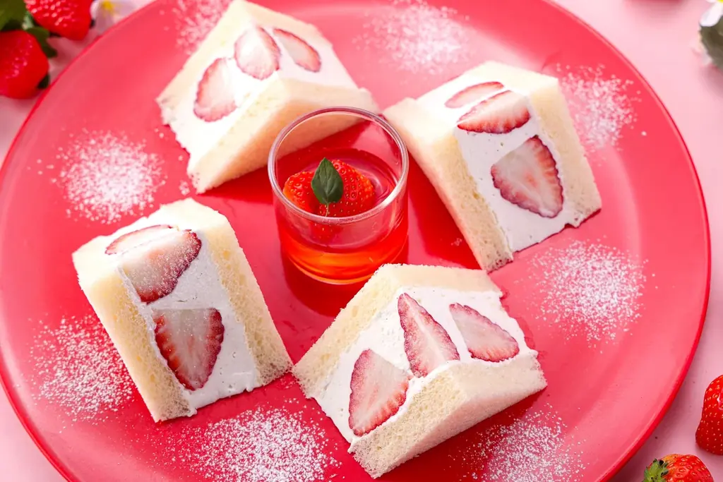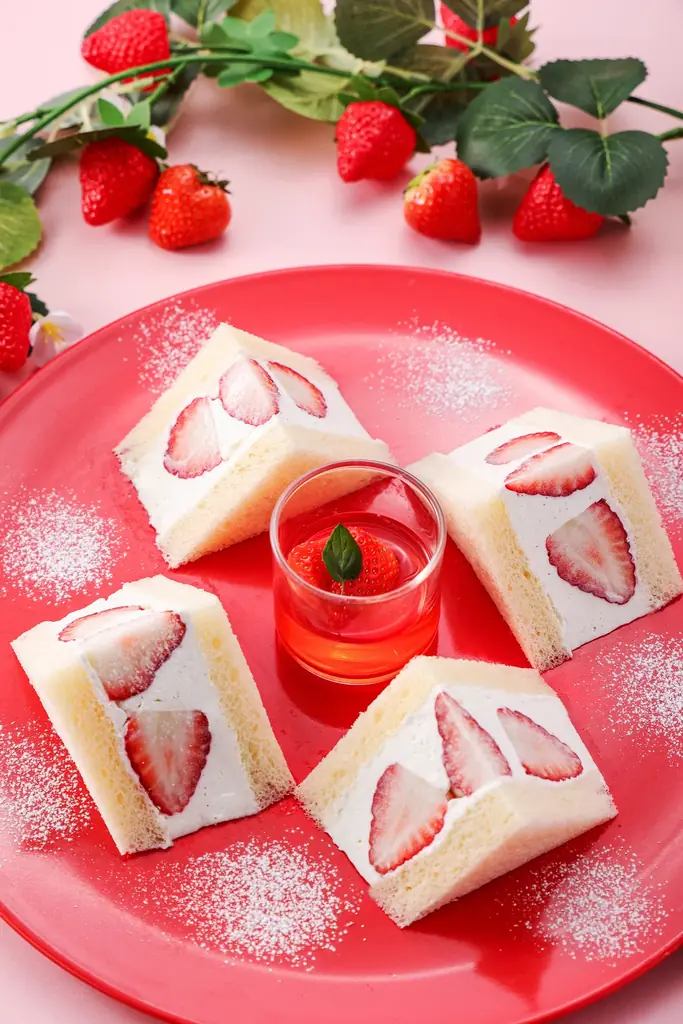 『ストロベリーサンドウィッチ』は、甘酸っぱさの際立つフレッシュないちごをホテルメイドのふわふわのパンで挟み、くちどけの良いクリームで仕上げたデザートサンドです。中央にはいちごゼリーを添え、果実感と甘酸っぱさの余韻を強める構成になっています。