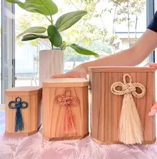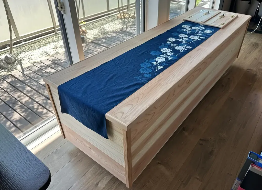 会場では三歩一建設が開発した県産材を使用した木の棺とお骨箱を展示する。県産材を用いた棺やお骨箱はやさしい色合いと香りが特徴で、川上から川下までの木材利用の実例として展示される。
