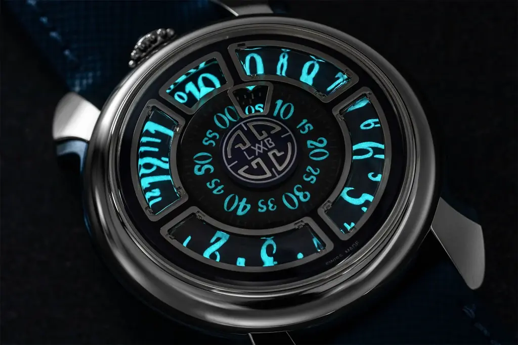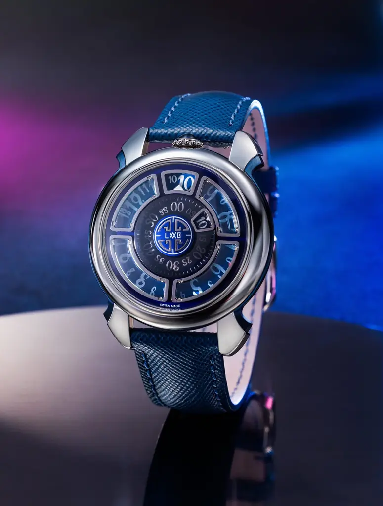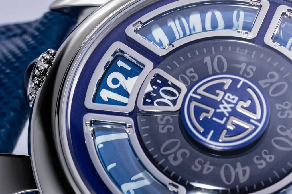 「LUCE」のデザインは、文字盤の素材と発光表現に重点が置かれている。深いブルーの文字盤は夜空を想起させ、中央の分表示にはラピスラズリが採用されている。天然石ならではの色合いと微細な模様が、文字盤に独特の表情を与えている。