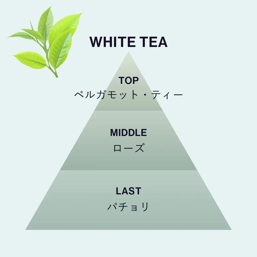 | 香り | WHITE TEA(ホワイトティー)、天然植物オイル配合(ベルガモット・パチョリ) |