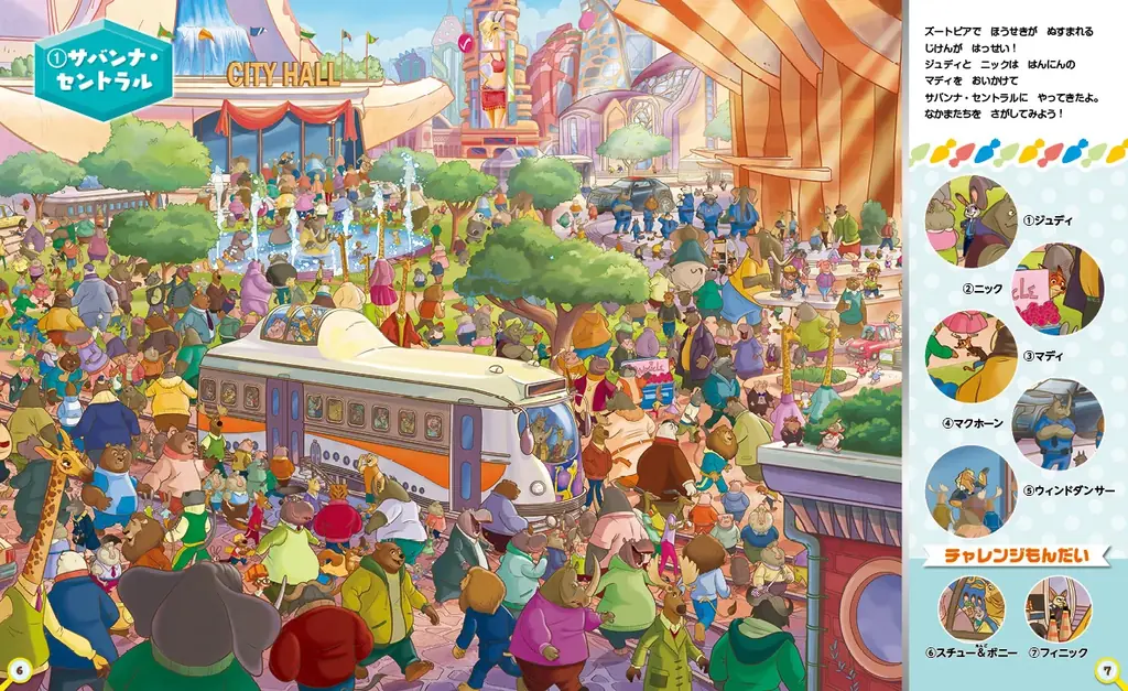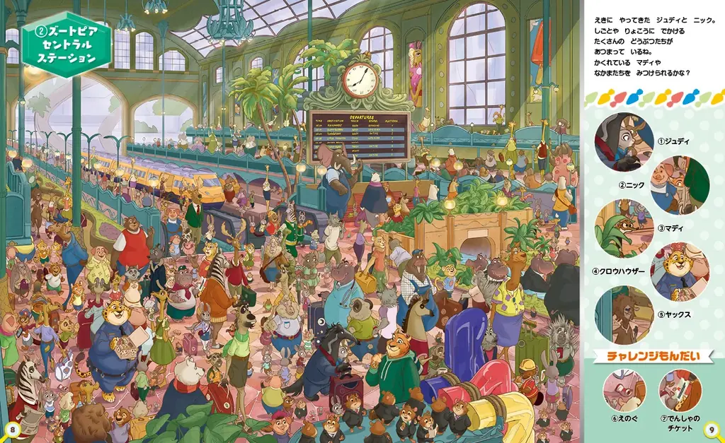 対象は3歳〜小学校低学年。ズートピアの12スポットを細密イラストで描いたさがし遊びで、ヒント付きなので初めてでも親子で楽しめます。