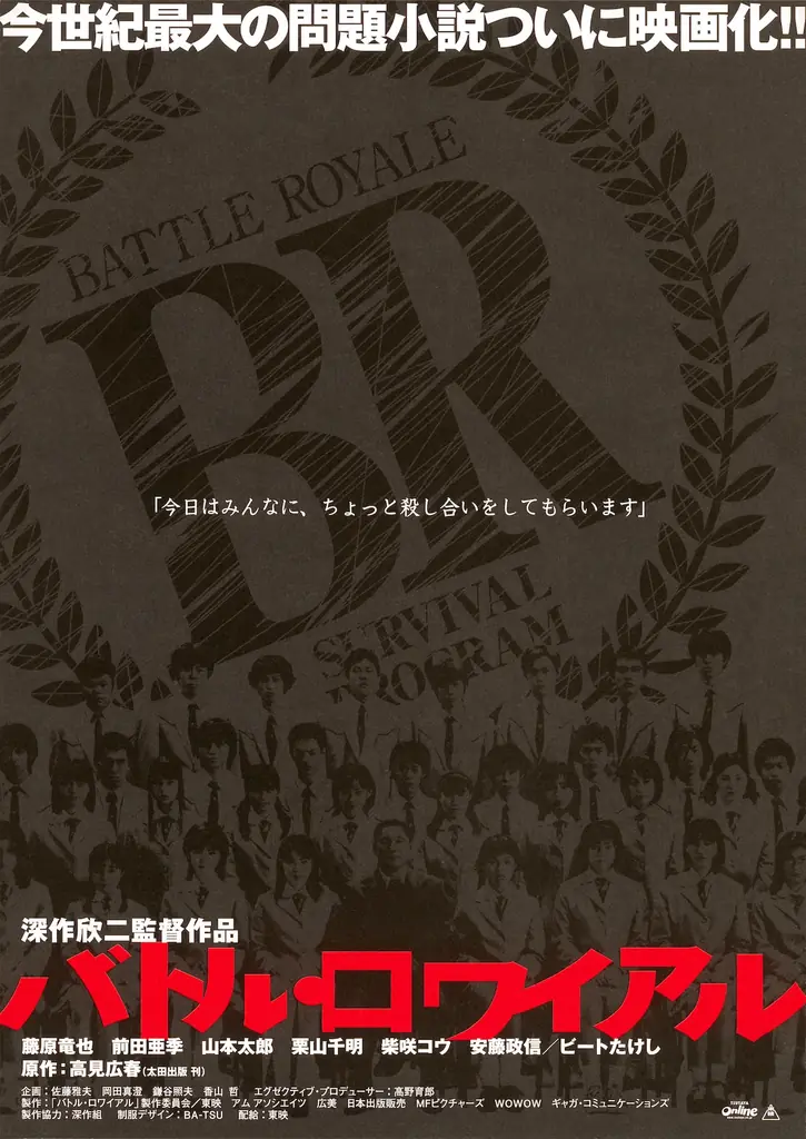 『バトル・ロワイアル』は2000年公開の日本映画で、上映時間は113分。原作は高見広春(太田出版 刊〜幻冬舎文庫収録)、監督は深作欣二、脚本は深作健太が担当している。出演者には藤原竜也、前田亜季、山本太郎、栗山千明、柴咲コウ、安藤政信、ビートたけしらが名を連ねる。