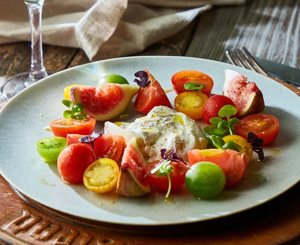 イタリア産ブラータチーズと季節のフルーツ、カラフルトマトのカプレーゼ 2,080円