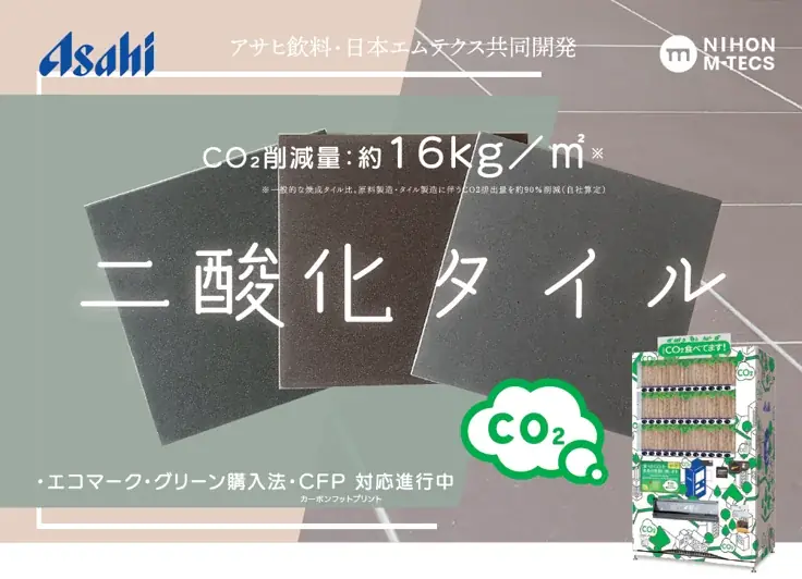 - アサヒ飲料(株):自販機で回収した吸収材を再利用した屋内用床・壁タイル。原料の90%以上がアップサイクル素材で、製造時のエネルギーを削減。通常タイルの約5倍の強度を実現し、防災性能が向上します。