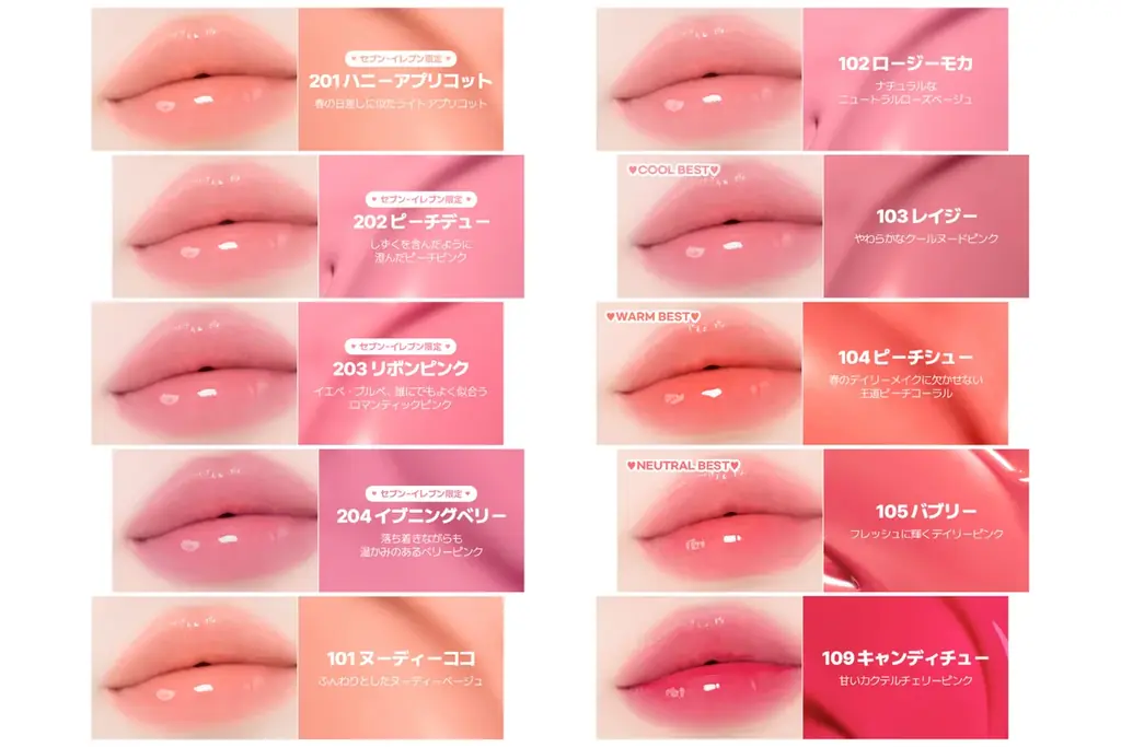 このミニティントはセブン-イレブン限定カラー4色と通常カラー6色、合計10色のバリエーションで展開されます。以下は各色の名称と簡単な色味の説明です。