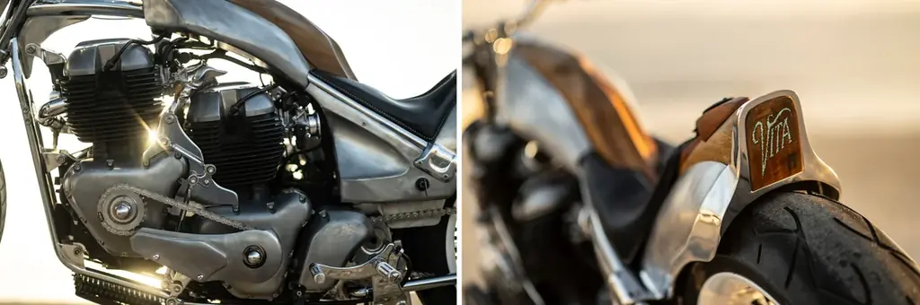 VITAはCLASSIC 650の648cc並列2気筒エンジンを2基並列に搭載した極めて特殊なカスタム。前側のミッションを外してクランクケースを短縮し、左右プライマリーチェーンで前後エンジンを連結する独創的な機構と、マホガニー+アルミ素地の素材表現が特徴だ。