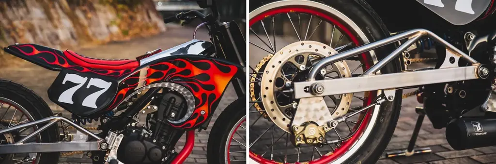 具体的にはGRR450のメインフレームを活かしつつリアフレームを新設し、外装はすべてアルミ鋼板から板金加工で製作。スイングアームはクロモリ鋼管を用い、ブラスブレージングで仕上げたオリジナル品です。リアサスペンションはセッティングの容易さを優先して直押しタイプに変更されています。