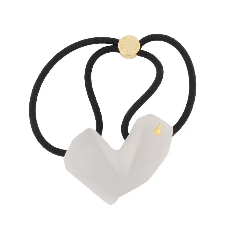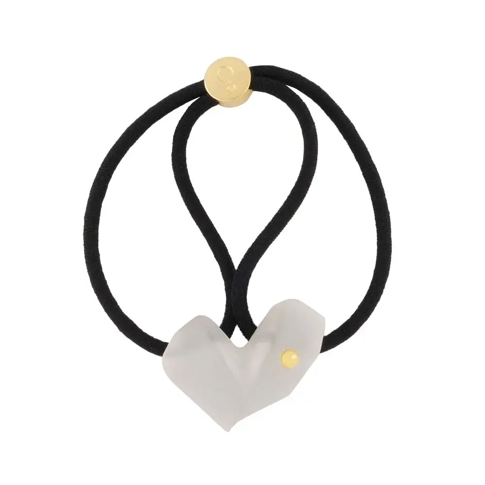 パウダリーなテクスチャーが大胆なファセットを持つハートモチーフを落ち着いた印象に変え、日常のポニーテールやMサイズのポニーとのレイヤードで洗練された存在感を与えます。テクニックを必要としないためギフトにも適する点が公式ポイントとして挙げられています。