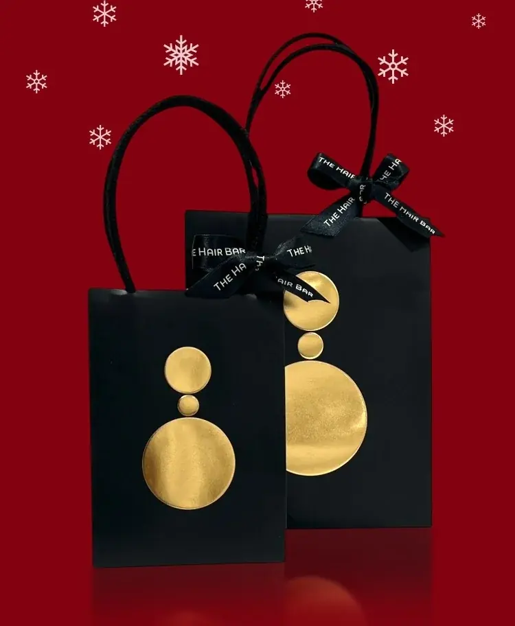 ホリデーラッピング 12月25日(木)までホリデー限定ショッパーでラッピング。オンラインは希望者に同梱可。マット黒×ゴールドエンボスのデザイン。