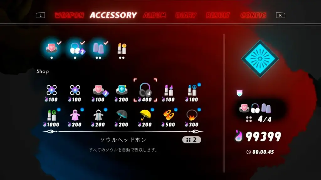 さらに、ゲーム開始時にいくつかのアクセサリーセットから選択して自分のプレイスタイルに合ったビルドを作成できるため、プレイスタイルに応じた柔軟な遊び方が可能です。アクセサリと武器の組み合わせで多彩なビルド構築が行えます。