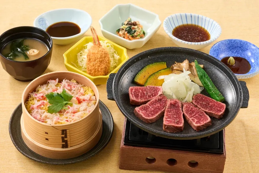 - 牛みすじステーキと本ずわい蟹のせいろ御飯膳