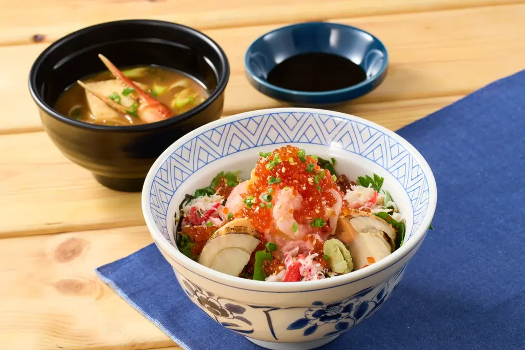 内容:本ずわい蟹、北海道産帆立を含む7種の具材を豪快に盛り付けた海鮮丼。セットで選べる蟹汁は、八丁味噌を45%使用した仕様です(味噌に占める割合45%)。